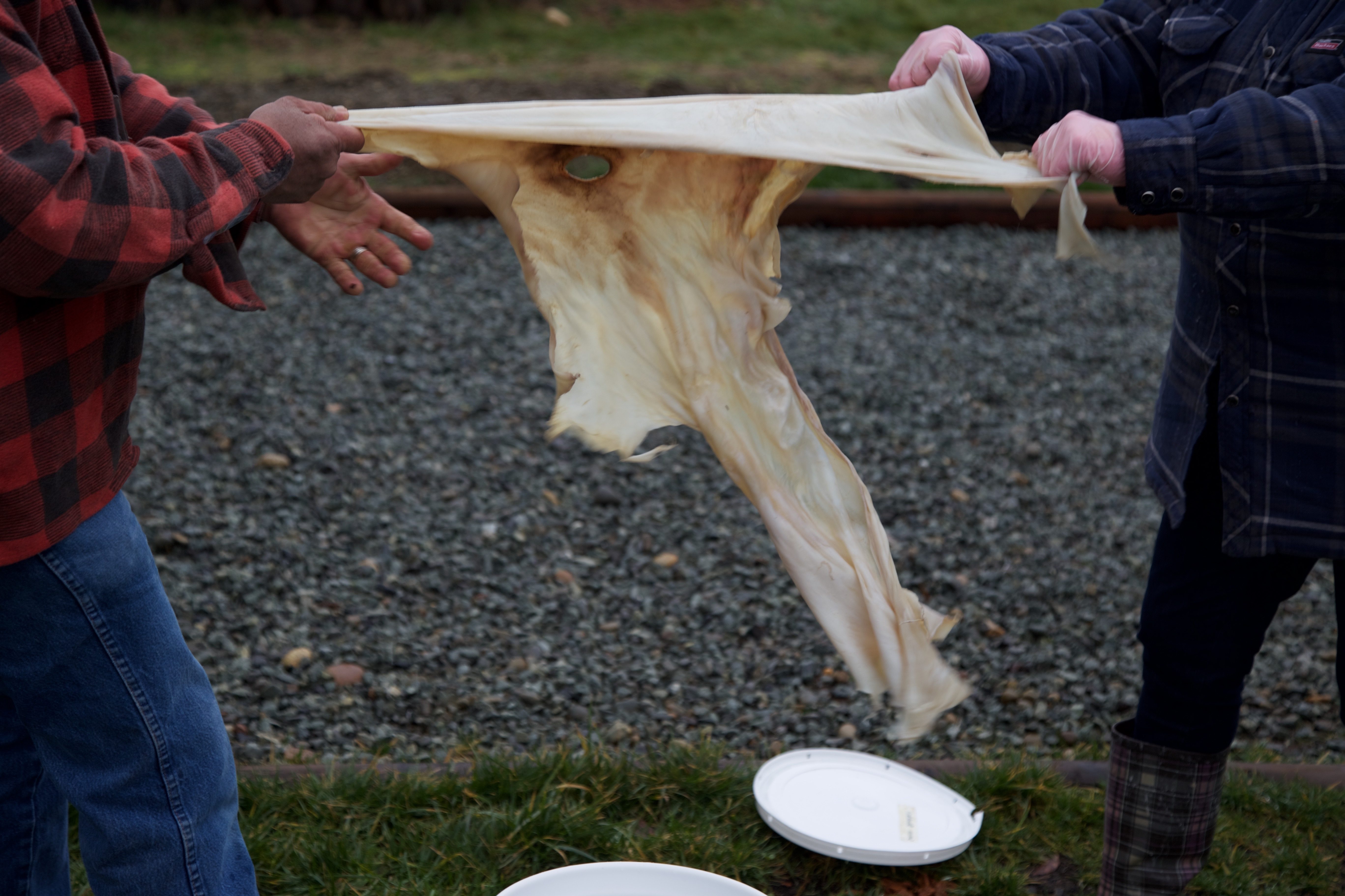 Twelve-year-old Talon Pascal and his cousin, Qwilqen Nelson, 14, are the youngest of an ethnically diverse group of people learning how to use brain matter to preserve and soften deer hides. The pair have travelled from Mount Currie, a community just north of Whistler. They have been watching YouTube videos and books, but this hands-on session is the next step in their learning.