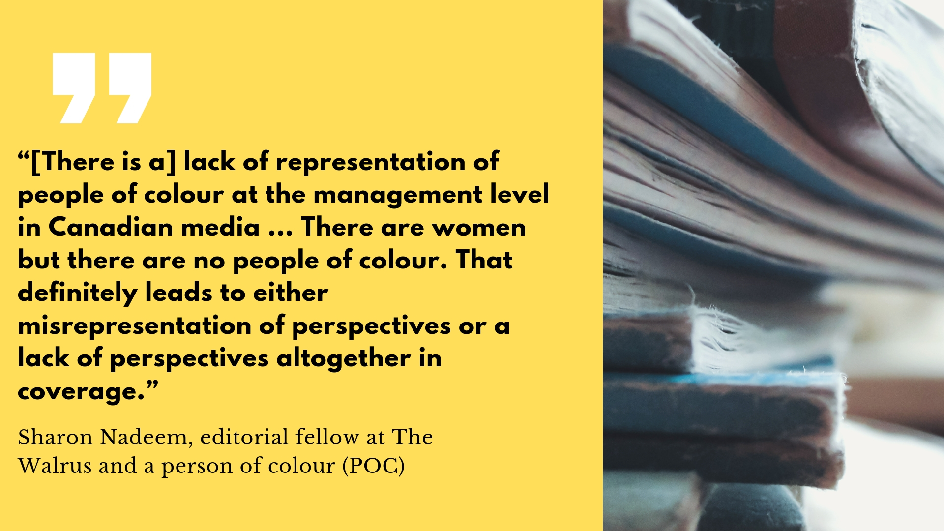 In the United States, “racial and ethnic minorities comprise almost 40 percent of the U.S. population … [but] make up less than 17 per cent of newsroom staff at print and online publications, and only 13 per cent of newspaper leadership,” according to research from the Columbia Journalism Review. The statistics are similar in Canada.